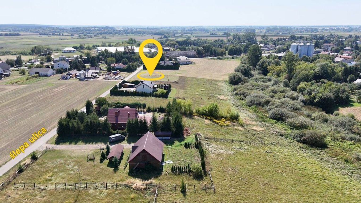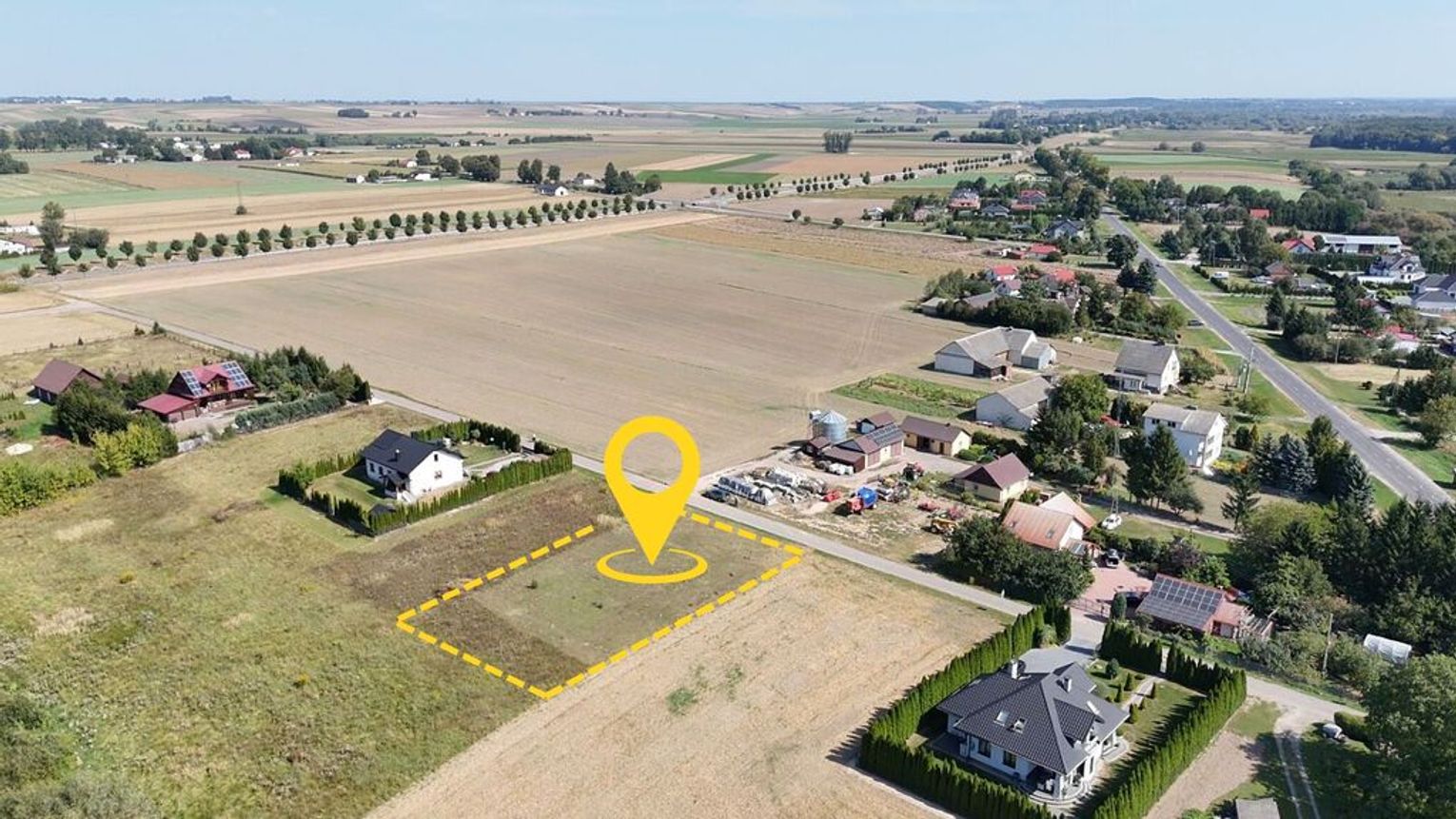 Działka znajduje się wśród luźnej zabudowy domów jednorodzinnych, pól i doliny rzeczki, co zapewnia spokój oraz przyjazne i bezpieczne sąsiedztwo.