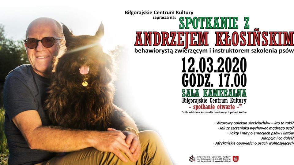 Biłgorajskie Centrum Kultury zaprasza 12 marca na spotkanie z Andrzejem Kłosińskim - behawiorystą zwierzęcym i instruktorem szkolenia psów. Odbędzie się ono w sali kameralnej BCK o godz. 17. Wstęp jest wolny, ale mile widziane będzie, gdy uczestnicy przyniosą karmę dla bezdomnych psów i kotów.