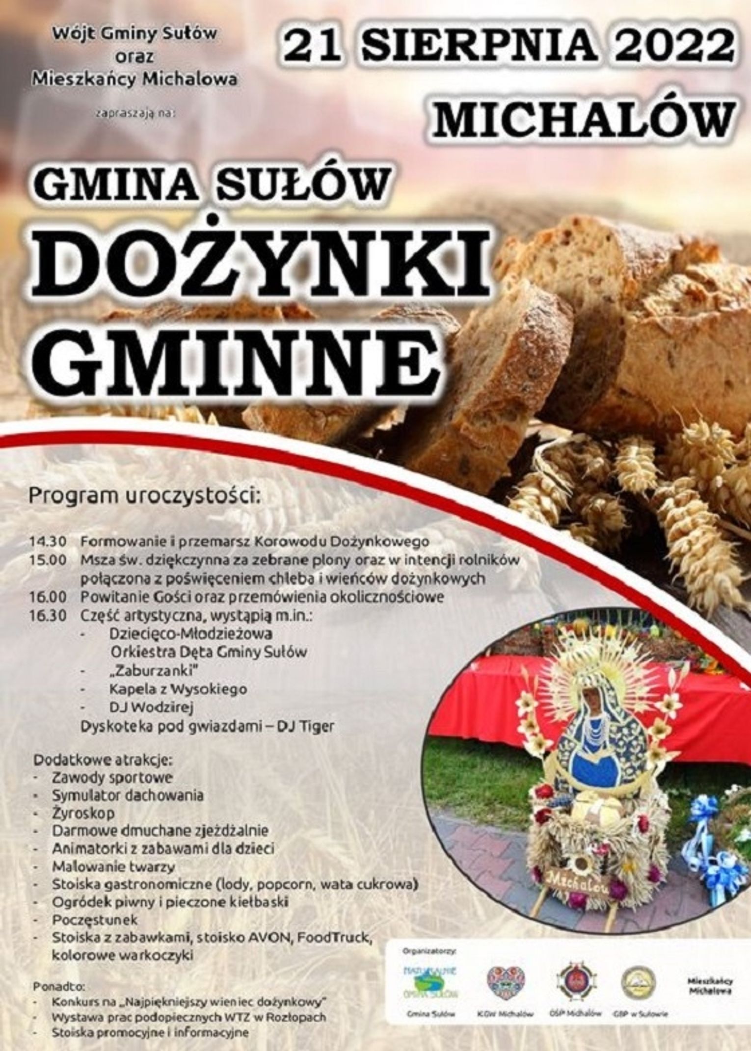 Już w niedzielę 21 sierpnia w Michalowie (boisko przy szkole podstawowej) odbędą się dożynki gminy Sułów. Początek o 14.30. Będzie mnóstwo atrakcji.