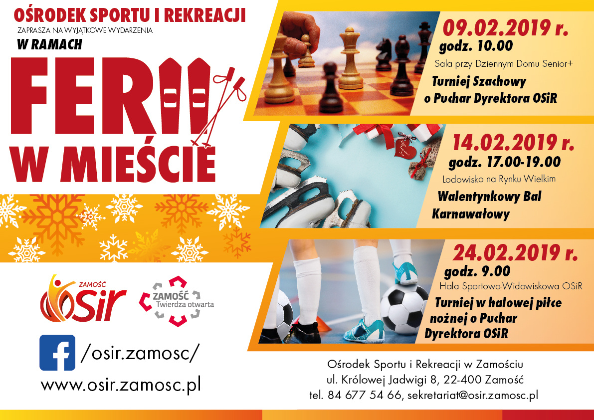 - – Lodowisko (w terminie: 17-24.02.2019 r.) – pięciu pierwszych Klientów (każdego dnia), którzy przy kasie użyją hasła „OSiR-Z nami sięgaj wyżej” otrzyma darmową wejściówkę do wykorzystania w Krytej Pływalni.